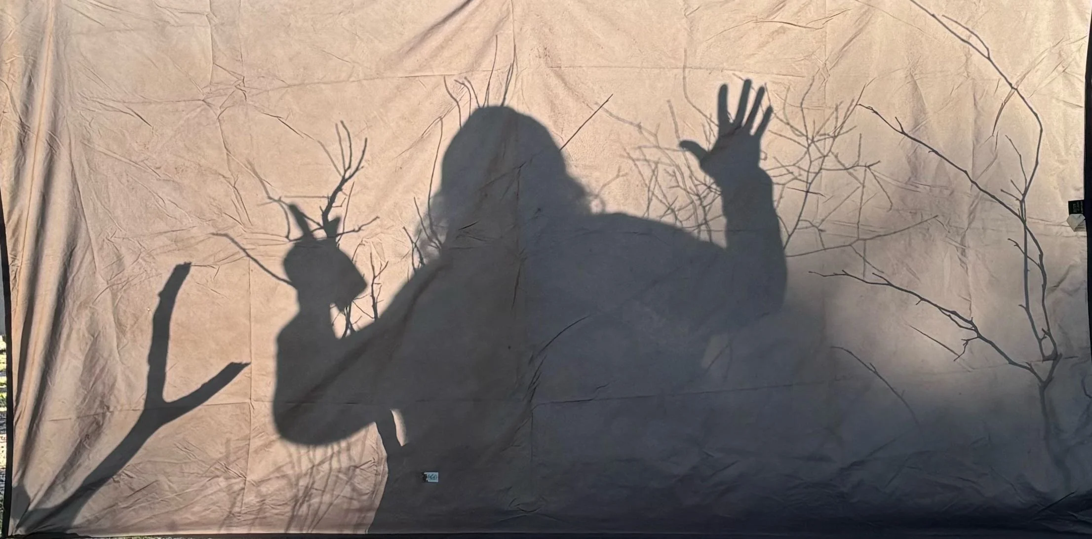 As the piece evolved, the scope shifted to incorporate new, and at-times, unexpected developments. This artwork began as a solo effort but shifted to heavy collaboration with classmates, who advocated for the incorporation of taller found materials with pruning applied to specific sections of the twigs to create intentional shapes to cast shadows. In addition, various class members provided found materials to include in the piece. Initially this piece was intended to be viewed after sunset using projected artificial light to conjure harsh shadows. Following installation during the early dusk hour, divine providence intervened with the sun shifting downward above the adjacent tree line providing an abundance of rich natural light casting shadows onto the canvas. At this revelation, I decided to convene the class to view the experience in the brief window of time before the sun became obscured by the trees.